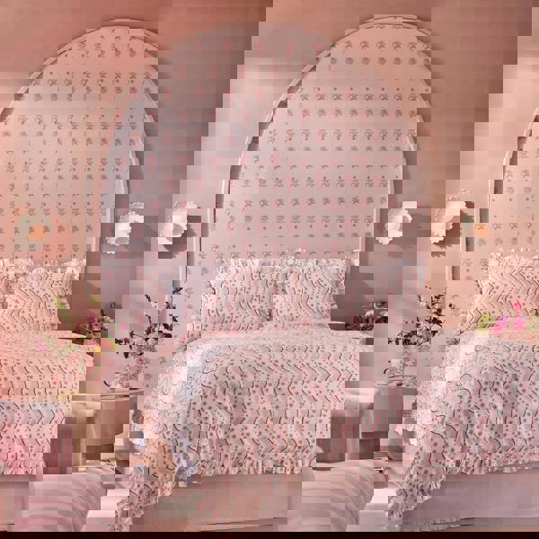 Spitalfield Bunches Pink wallpaper is a timeless floral design featuring single florals wrapped in ribbon, scattered across a baby pink background, creating a romantic, uplifting repeat that feels full of charm. Perfect for bedrooms, reading nooks or cosy corners, this wallpaper brings a soft sense of nostalgia with a fresh, light touch. Printed on non-woven paper for easy hanging and a beautifully smooth finish.