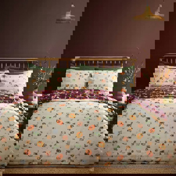 Bring the outdoors in with this autumnal inspired bedding, a symphony of pumpkins, leaves, and acorns in warm shades of oranges, browns, and greens and set against a pure white base.