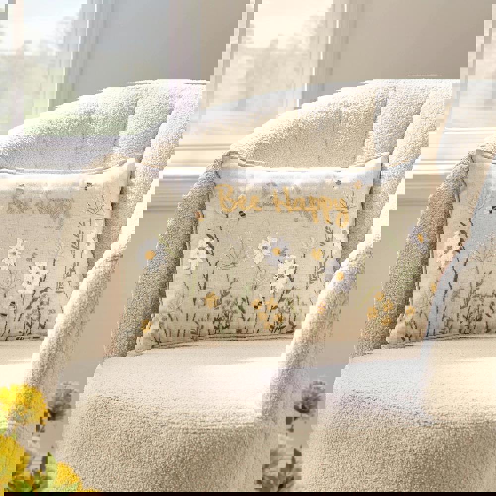 Bring a joyful buzz to your space with this cheerful cushion, sprinkled with daisies, wildflowers, and busy little bees. Featuring the uplifting message “Bee Happy” in sunny golden lettering, it’s a gentle reminder smile, and soak up life’s simple pleasures.
