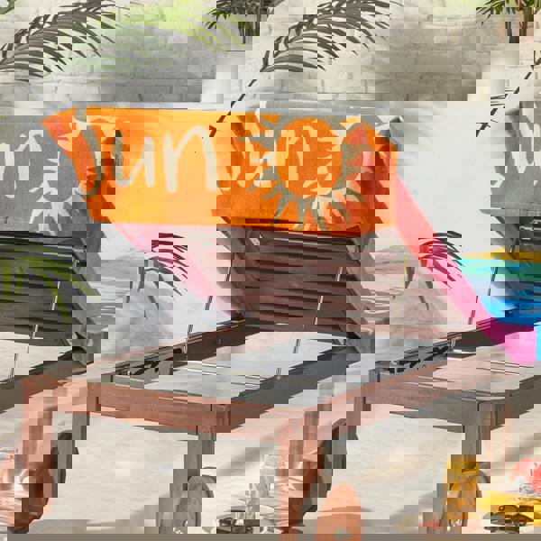 Brighten up your beach days with this vibrant multi-coloured towel, celebrating the sun. Featuring bold bands of colour and playful suns, each section is adorned with different languages adding a touch of global flair to your summer essentials. Soft, absorbent, and full of personality, it’s the perfect companion for beach breaks, poolside lounging, or fun in the garden. This 100% cotton towel comes with a practical 'hood' to secure to the lounger seat. No more slipping or shifting towels as you enjoy your sun-soaked moments.