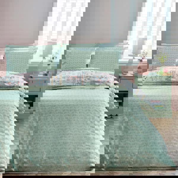 Bring eclectic charm to your bedroom with this folk-inspired patchwork design, blending soft pastels with delicate floral motifs. Fully reversible, with a calming geometric print on the reverse for a versatile look. Created from easy-care recycled polyester and soft cotton, blended for everyday use.