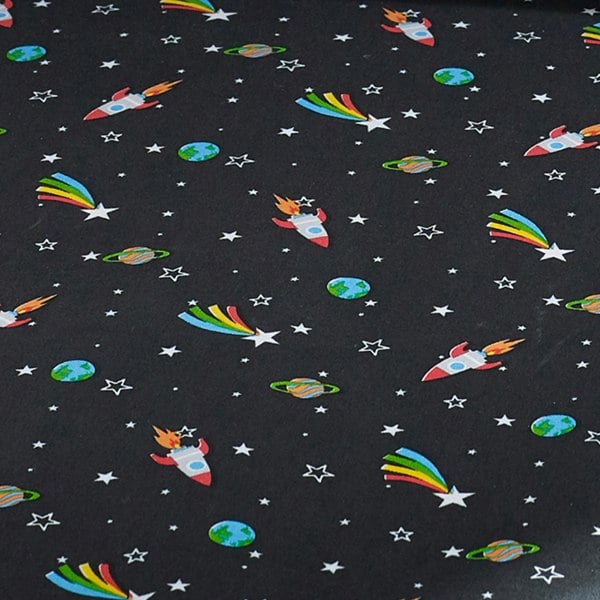 Featuring a vibrant mix of soaring rockets, rainbows, planets, and twinkling stars on a bold black background, this sheet is perfect for little dreamers and space explorers.