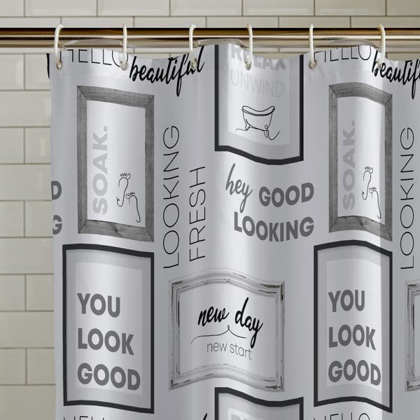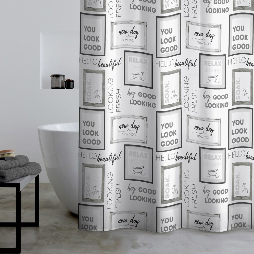 Create a calming and stylish feel in your bathroom with the relax and unwind shower curtain. Featuring framed quotes in chic monochrome tones, it adds a fresh and uplifting touch to your space. Designed for practicality, it includes a water-resistant treatment and easy fit eyelet header, so you can ensure your bathroom is functional and fashionable.