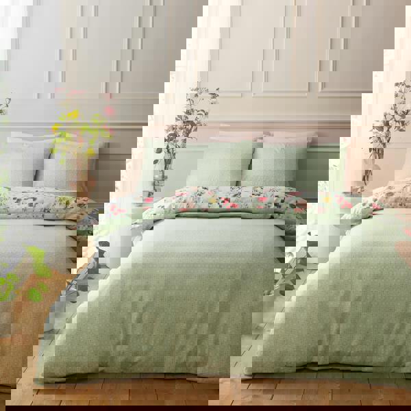 Celebrate the beauty of nature with this elegant floral bedding set, inspired by the charm of a traditional garden in full flourish. Set against a soft green ground, the design features a harmonious scatter of finely illustrated blooms intertwined with leafy sprigs and fluttering butterflies. Perched gracefully among the florals, delicate songbirds add a uplifting touch capturing the serenity of the outdoors. Digitally printed on luxuriously soft brushed microfibre, this design captures every detail with striking clarity, offering both comfort and sophistication.