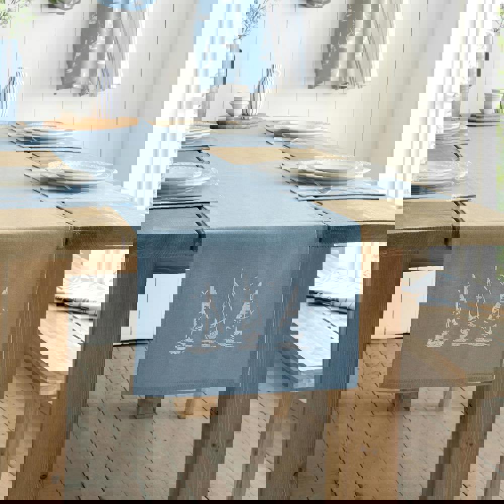 Bring the spirit of the sea into your dining space with this charming sailing boat design. Inspired by tranquil harbours and ocean breezes. This runner captures a relaxed coastal retreat, where calming embroidered sailboats glide across a soft blue base. Crafted from easy care, durable 100% cotton fabric, this table runner is perfect for everyday use or special occasions. Its timeless appeal makes it a stylish addition to any dining table, adding warmth and elegance to mealtimes.