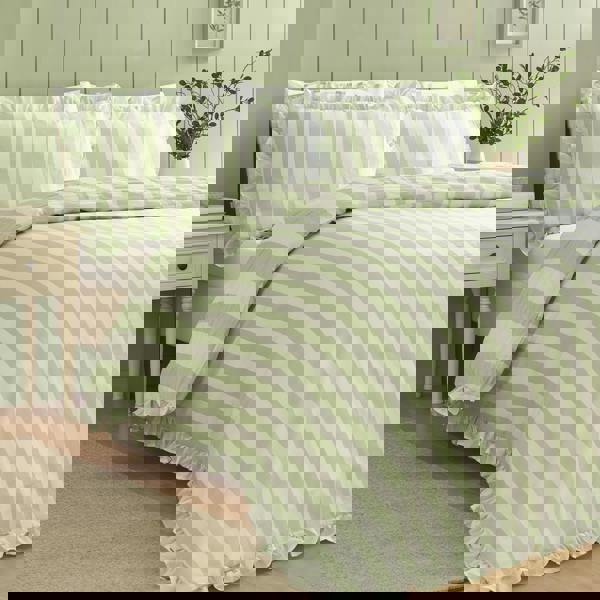 Effortlessly fresh and full of charm, this bedlinen features classic stripes on a textured seersucker base for a light and airy feel. Beautifully complemented by frill detailing, this design strikes the perfect balance between sweet and sophisticated. Perfect for creating a relaxed yet stylish space with subtle texture and timeless appeal. Created from easy-care recycled polyester and soft cotton, blended for everyday use.