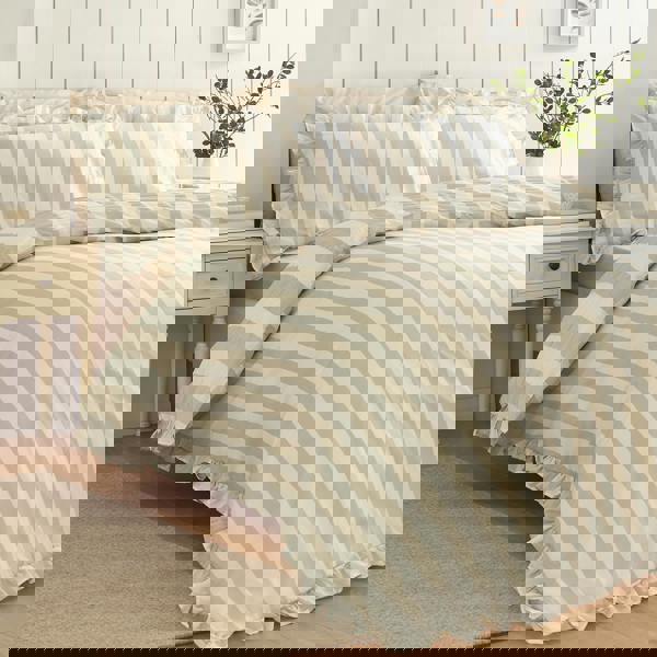 Effortlessly fresh and full of charm, this bedlinen features classic stripes on a textured seersucker base for a light and airy feel. Beautifully complemented by frill detailing, this design strikes the perfect balance between sweet and sophisticated. Perfect for creating a relaxed yet stylish space with subtle texture and timeless appeal. Created from easy-care recycled polyester and soft cotton, blended for everyday use.