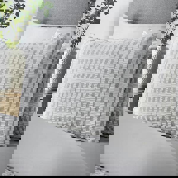 Alternating bands of gentle seersucker and smooth contrasting textures create a crisp, look that’s both contemporary and calming. With its tonal palette and modern minimalism, this piece brings subtle dimension to your space, perfect for elevating understated interiors with refined texture and effortless style.