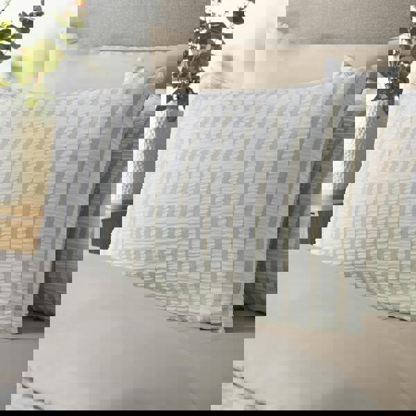 Alternating bands of gentle seersucker and smooth contrasting textures create a crisp, look that’s both contemporary and calming. With its tonal palette and modern minimalism, this piece brings subtle dimension to your space, perfect for elevating understated interiors with refined texture and effortless style.