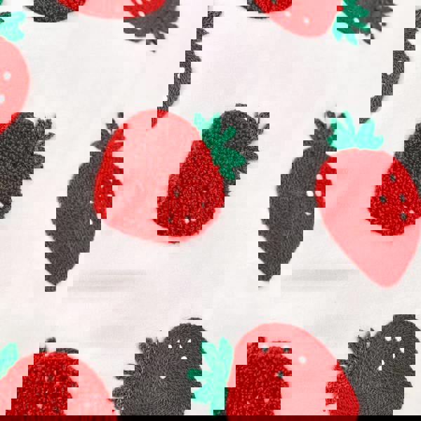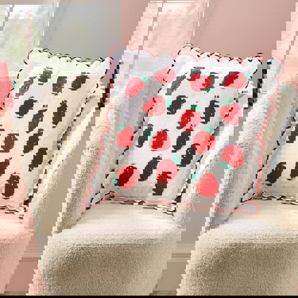 Add a pop of fruity fun to your room with this delightful strawberry cushion, it’s the perfect way to bring a taste of summer sunshine indoors. Bursting with bright red strawberries and finished with a charming, scalloped border in contrasting trim. Fresh, fruity, and full of charm.
