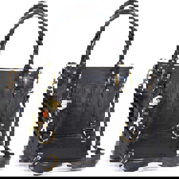 Pockets: 2 Main Compartments + 1 Central Zipped Pocket + 1 Interior Side Zipped Pocket + 1 Leather topped Mobile Phone Holder + 1 Leather topped Extra Open Pocket + 1 Outer Front Slim Pocket containing Photo ID Card Window + 1 Outer Rear Zipped Pocket