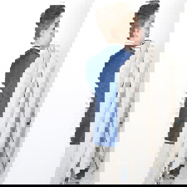 Made from a mid-weight beige fabric twill with blue detailing. The jacket has contrasting black velvet trims on the front pockets, with a stunning satin lining printed with a funky bright colourful bottle print. Two inside pockets. The matching suit trousers have a part-elasticated waist for additional comfort, a back pocket which fastens with a blue button. To complete the look, the waistcoat features decorative front pockets, fastens with blue buttons and a detachable chain brooch on the jacket.