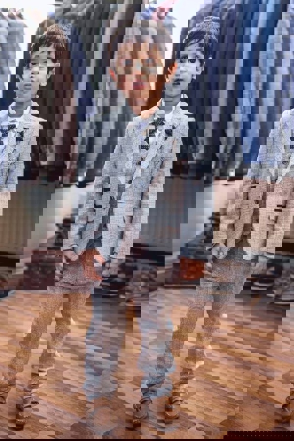 Made from a mid-weight light sky blue and ivory tweed with a subtle blue check detailing. The jacket has matching blue velvet trims on the front pockets, with a stunning satin lining. Two inside pockets. The matching suit trousers have a part-elasticated waist for additional comfort, a back pocket which fastens with a blue button.