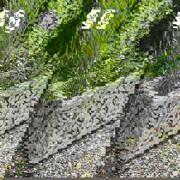 This rustic, heavyweight cast stone garden trough is handcrafted using traditional Celtic patterns. This versatile stone outdoor planter pot is guaranteed to last a lifetime as the crowning touch of a mythical style garden. This concrete flowerpot is made weather resistant and easy to assembly. Extremely heavy and sturdy piece which is made to last. The trough has an aged patina with stunning raised detail to every side, so you get the full effect from all angles. Comes with two drainage holes.