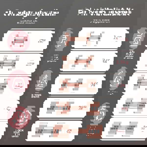 This adjustable dumbbell offers 4 different weight settings ranging from 1. 4kg to 5kg for a single dumbbell and from 2. 8kg to 10kg for a pair of dumbbells.