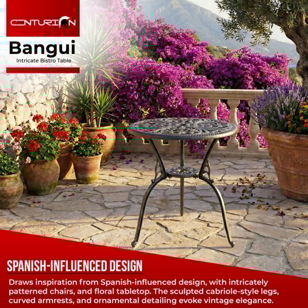 Made from no-rust cast aluminium, the Bangui outdoor table is strong yet lighter and easier to move than the traditional cast iron predecessor. It is low maintenance and easy to keep clean, it has been powder coated for durability and comes complete with rubber pads for steadiness.