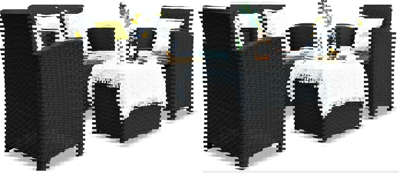 The Santana garden furniture set comprises of one double sofa, two single sofas, complete with UK Fire Resistant Cushions, and a coffee table with generous storage.