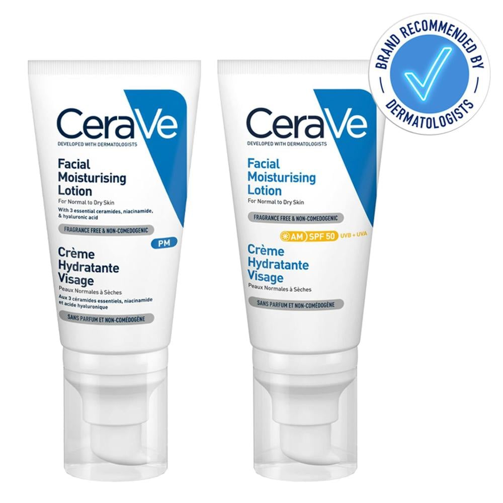 For your daily facial routine, firstly cleanse with CeraVe Hydrating Cleanser for normal to dry skin, or CeraVe Foaming Cleanser for normal to oily skin. Secondly, give your skin a hydration boost with CeraVe Hydrating Hyaluronic Acid Serum, and finally finish with CeraVe AM Facial Moisturising Lotion SPF50+ to hydrate while protecting the skin from daily aggressors.