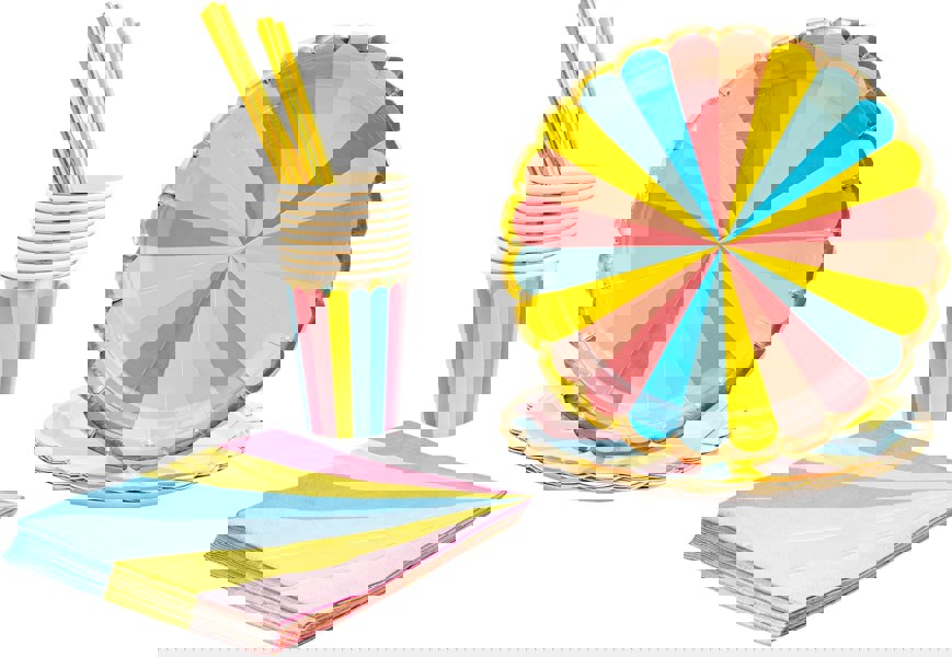 Make your party go with a swing and impress your guests with these party tableware sets, perfect for children's parties, picnics and family gatherings. No need to waste time washing up at the end of your party, simply dispose of or recycle the tableware. Each matching set contains 10plates (23cm diameter), 10 cups (9. 5cm height), 10 napkins and 10 straws (19. 5cm length). Choose from 3 vibrant and colourful designs.