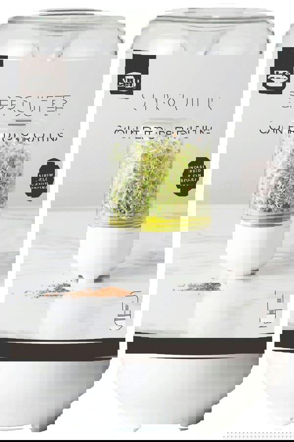 Sprout at home with style and ease. Whether you’re a big fan of alfalfa, or want endless broccoli sprouts for your salads, this lovely looking sprouting jar kit is ready to grow nutritious goodness in your kitchen. This sprout growing kit's glass vessel is designed with a highly effective patent-pending ventilation system, which makes for easy and beautiful sprouts that are worth leaving out on the countertop. The discreet pour spout makes the daily process of rinsing easy, so you can quickly grow your sprouts and enjoy them too! Includes a 12-month guarantee.