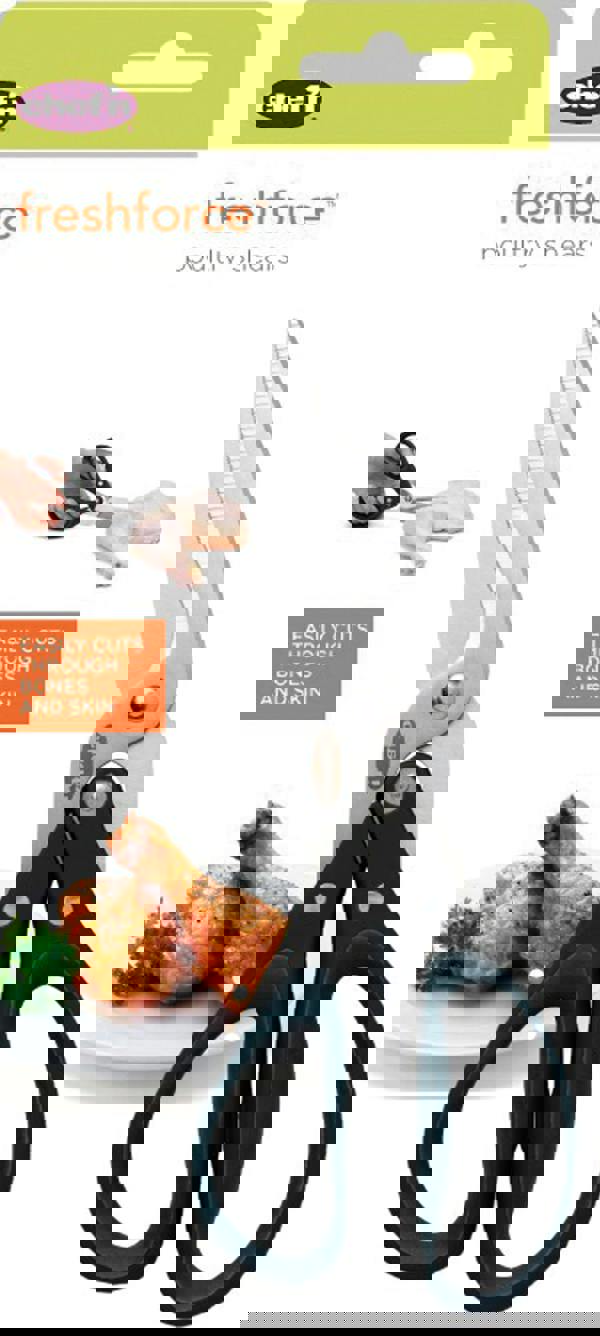 These poultry shears are a fresh solution for all your poultry-cutting needs. Prep juicy spatchcock chicken, nutty chicken satay and even the Christmas turkey like a pro, with these heavy-duty FreshForce™ poultry shears by Chef'n. Slide the serrated blade edges into any bird for stream-lined cutting through skin and cartilage without tearing the meat. The curved blades seek out even the hardest to reach bones, and feature a notch to hold them in place while you cut. The blades are made of high-quality stainless steel and are connected to a dual-gear mechanism that increases leverage, allowing you to exert more power with less force. Chef'n calls that cutting edge. Includes a 12-month guarantee.