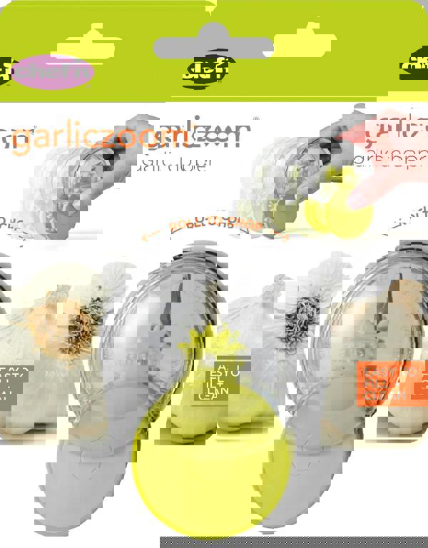 The iconic GarlicZoom® just got zoomier. Grinding up garlic has never been so fun! Fill this clever gadget with whole cloves of garlic and zoom it across surfaces to chop it up in seconds. The more you roll, the finer the chop, and as whole cloves fit inside, you won’t waste a morsel. This updated take on the Chef’n classic fits more garlic cloves, opens completely for easy access to the good garlicky stuff, and is designed for quick and easy cleaning without having to handle those sharp little blades. Includes a 12-month guarantee.