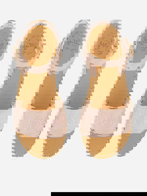 These girls’ sandals from Chloé come in powder pink leather with a branded finish. The design uses cow leather with a sheep leather sole and an embossed Chloé illustration. Golden buckle straps secure the fit, while front inserts carry Chloé embroidery for a clear logo detail.