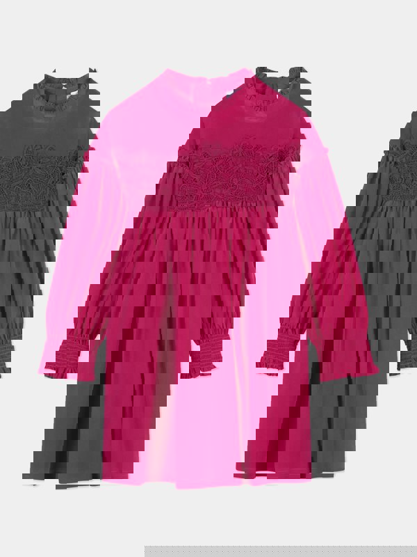 This girls ceremony dress from Chloé comes in fuchsia and combines silk crepe with a cotton twill lining. The neckline is finished with a flounce, while lace detail sits on the front. Signature Chloé embroidery appears on the bottom front for a branded finish.