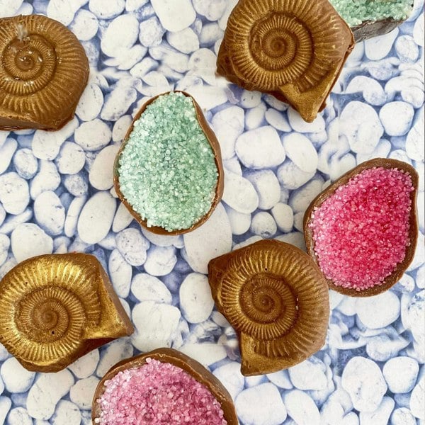 These ammonite chocolate-shaped fossils have been beautifully handcrafted by our artisan chocolatiers from smooth Belgian milk chocolate and dusted with edible gold dust. Added to the stuning collection are the glittering amethyst with blue and pink sugar coatings. Made with the finest attention to detail they make a wonderful chocolate gift that will melt in your mouth! Perfect for any budding archaeologists.