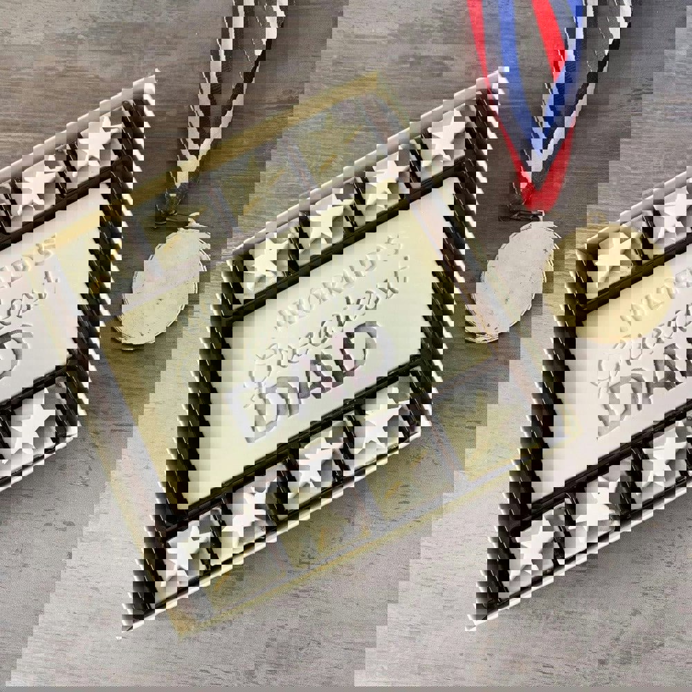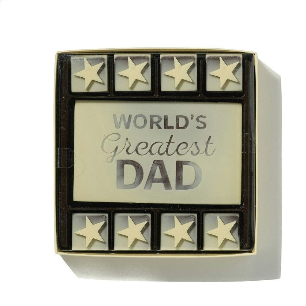 Show dad how much he means to you with a delicious chocolate gift. Our chocolate box contains a solid chocolate plaque, with the words 'World's Greatest Dad' surrounded by eight chocolate 'star' squares all lovingly handmade from the finest dark and white Belgian chocolate. The perfect chocolate gift box for any Father's Day or Birthday.