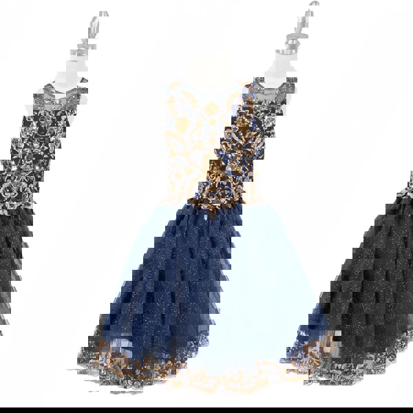 Beyond excited to describe this breathtaking and elegant satin glittered tulle dress, adorned with two-tone golden lace on a mesmerizing navy fabric.