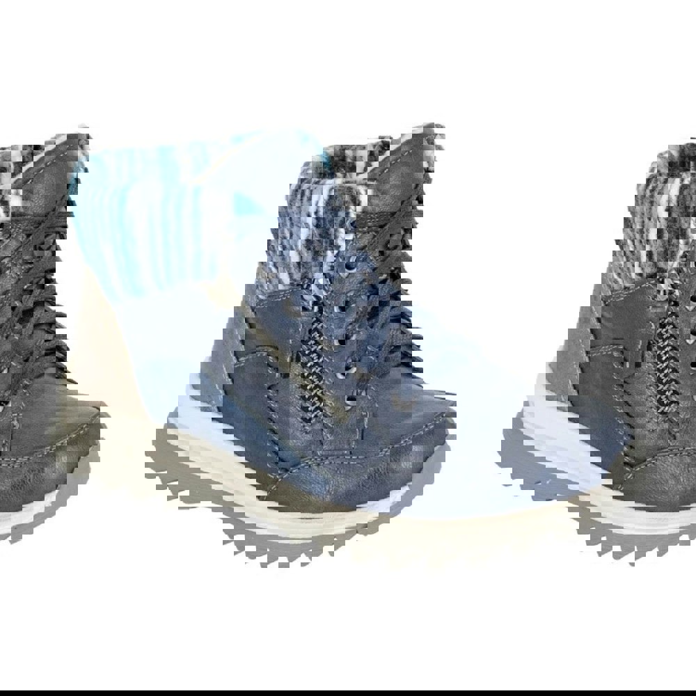 Cipriata Erte boots in navy with a mid-cut profile and round toe. The upper combines PU (polyurethane) and textile, finished with a stripe design. Faux fur lines the boot and continues through the insole for a consistent interior feel.