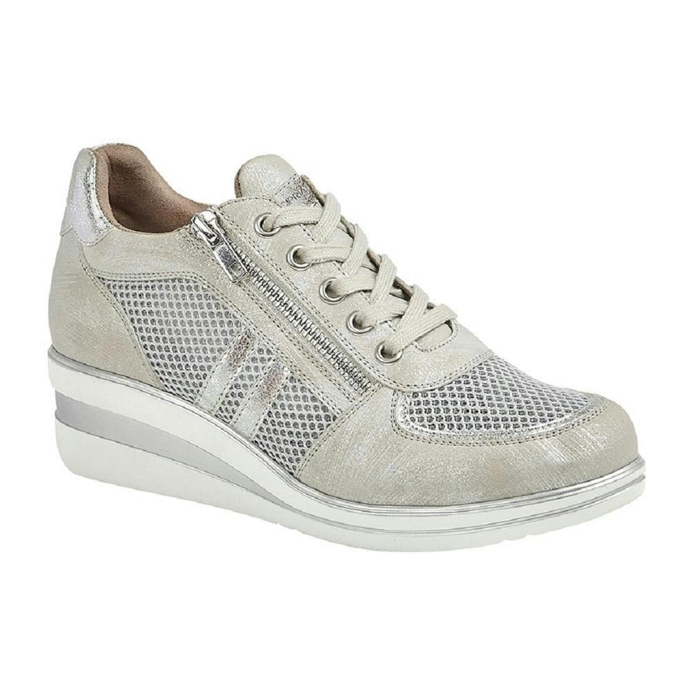 These Cipriata women’s trainers combine lace-up styling with a zip fastening and a subtle heel. The upper is finished in metallic brush PU/mesh, giving a distinctive look suited to everyday wear.