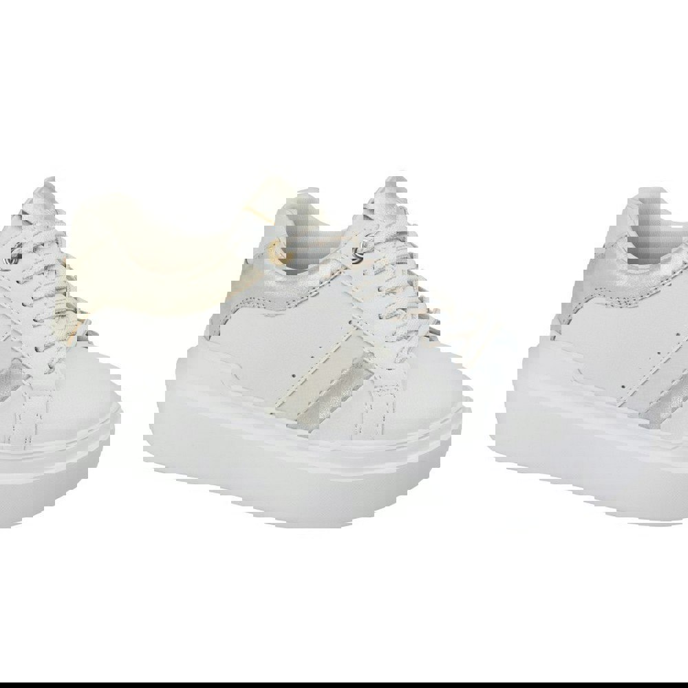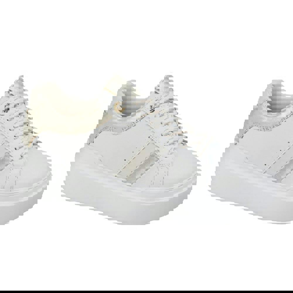 These lace-up platform trainers bring a clean, modern look with contrast detailing throughout. The upper is made from PU (polyurethane), paired with a textile lining and a textile sock insole for a consistent interior finish. A phylon outsole completes the construction, while perforated panels add texture to the design.