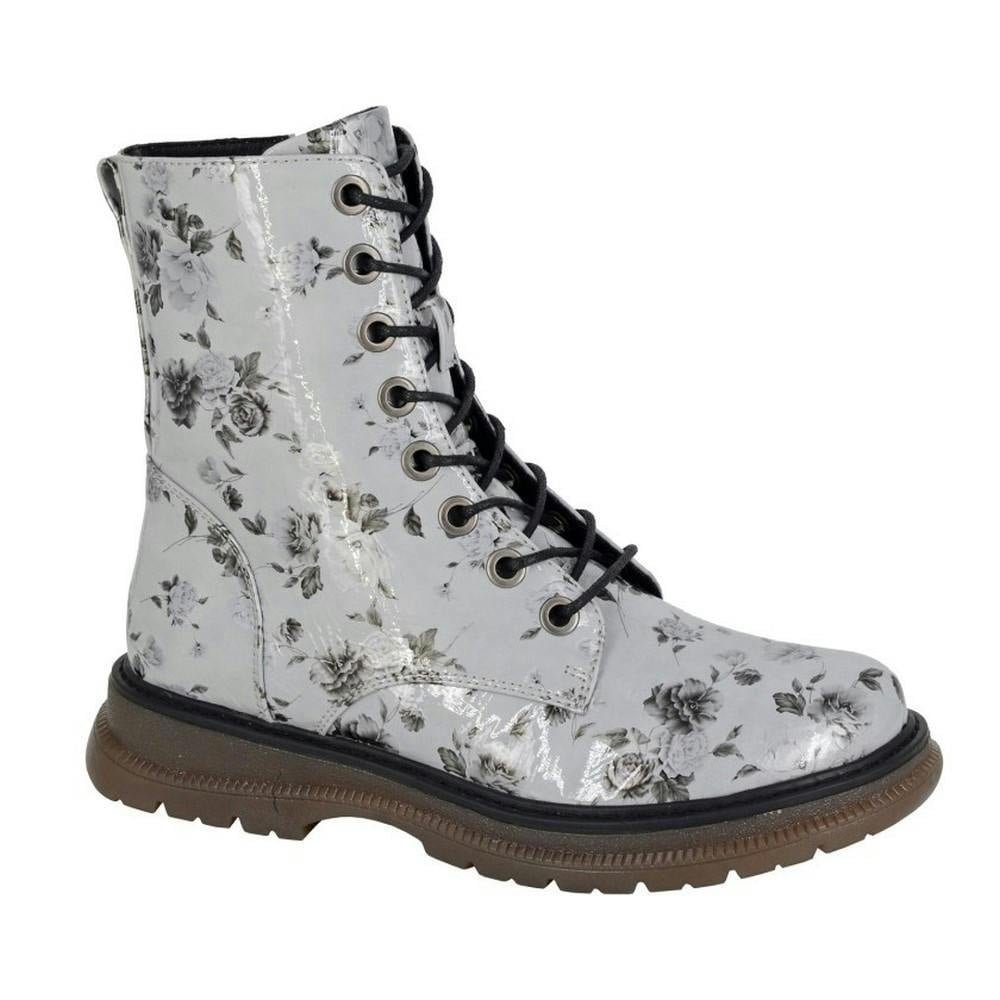 These ankle-high boots combine a floral design with a patent PU upper for a glossy finish. A lace-up front with 8 eyelets is paired with an inside zip fastening, offering two practical ways to secure the fit. A pull tab at the back helps with on and off.