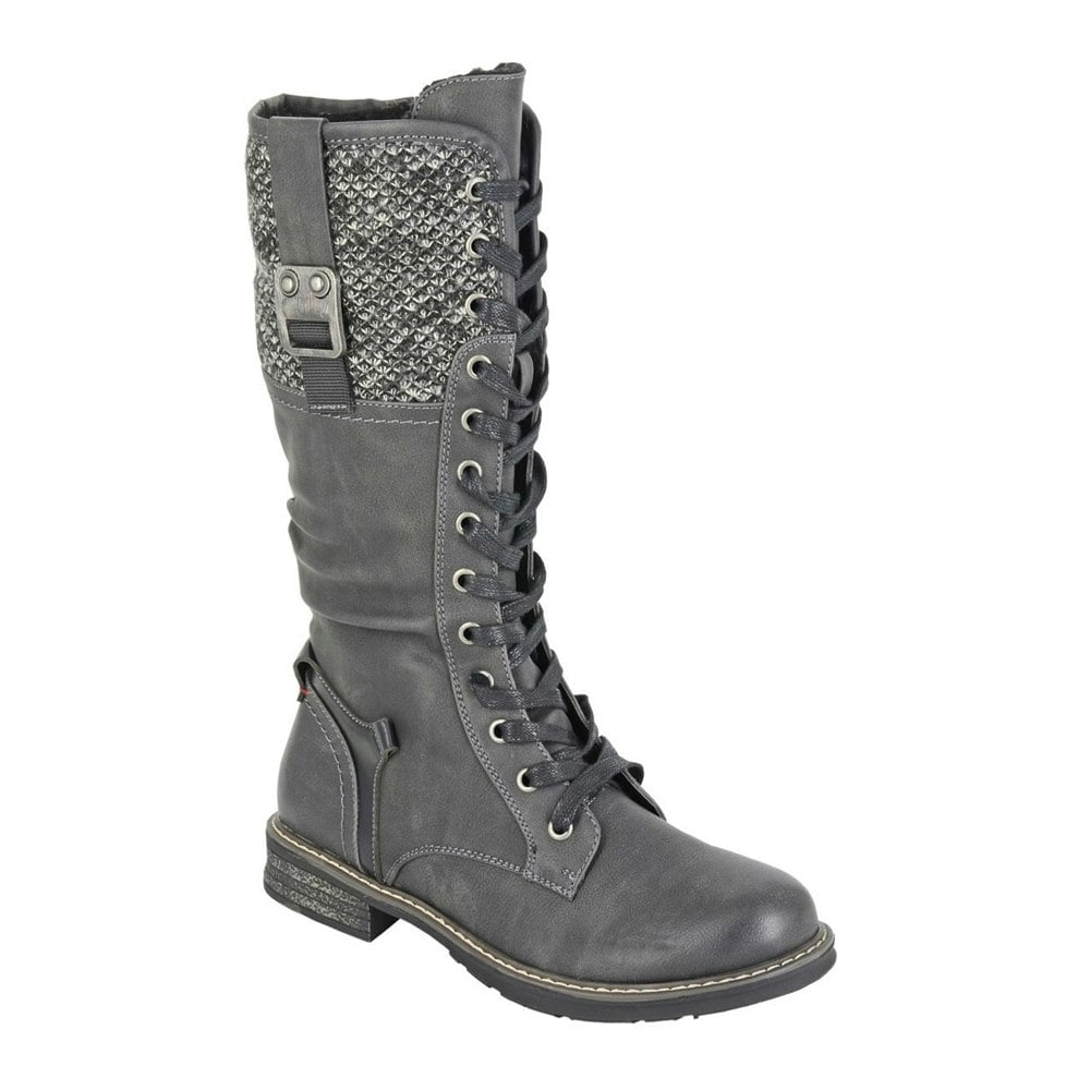 These calf-length combat boots come in a black and grey finish with a knitted design and a round toe. The upper combines other materials, PU (polyurethane) and textile, with a faux fur and textile lining for a layered internal feel. A lace-up fastening runs through 13 eyelets, creating a secure, adjustable closure.