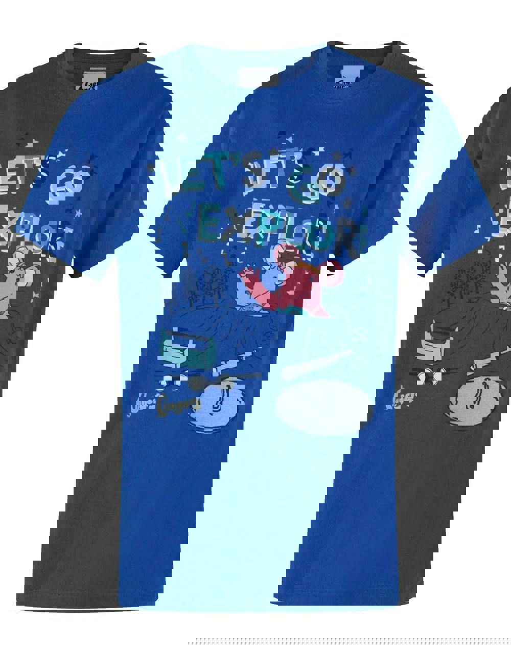 The design across the front of the t-shirt showcases the Clangers exploring their planet with the slogan style text 'Lets Go Explore in pale blue and white