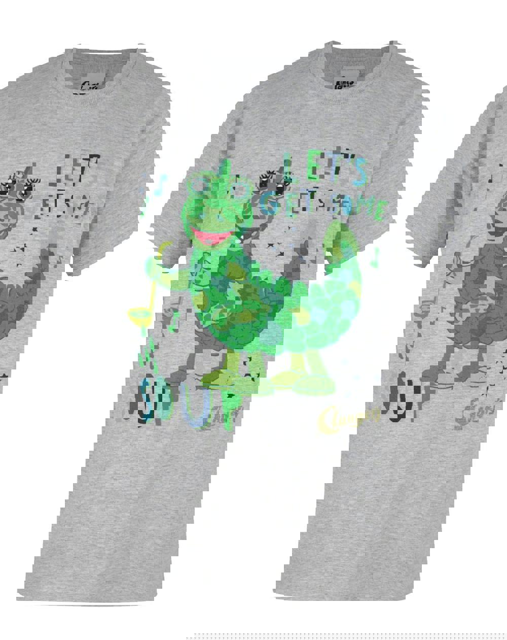 The design across the front of the t-shirt showcases the Clangers character the Soup Dragon, a female dragon that swells inside the soup wells within the Clangers planet
