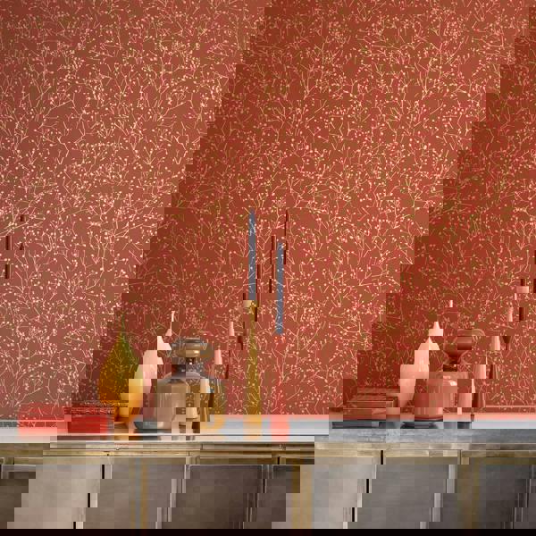 The Gypsophila Wallpaper features sprays of elegant seedheads screenprinted in gold metallic onto fibrous paper. The result is a beautiful botanical wallpaper with a lovely tactile texture. Clarissa spotted the bouquet that inspired this design at Blackshed flower farm in Dorset, and it still hangs from her studio ceiling in London today.