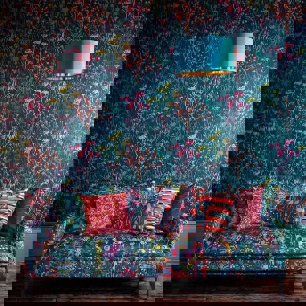 This Summer Border Wallpaper is a portrait of a rainbow meadow wilderness, against a deep teal background. The design was inspired by one of Clarissa favourite haunts - a magical garden belonging to her friend and renowned garden designer Tania Compton. The abundant tangle of grasses, teasels, dill seed heads and verbena captures the essence of wild and natural beauty.