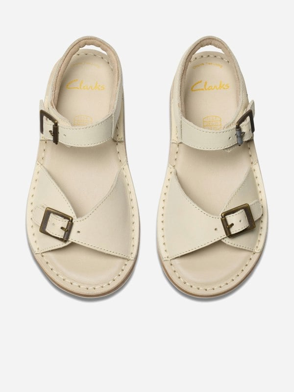 These Clarks girls PlaysunReef K sandals come in white leather with a traditional stitch-down look and contrast detailing. The upper uses 100% leather, paired with a chrome-free leather lining and a PU foam footbed. A padded collar adds extra comfort around the ankle, while the flexible TR midsole and flex-grooved outsole support easy movement.