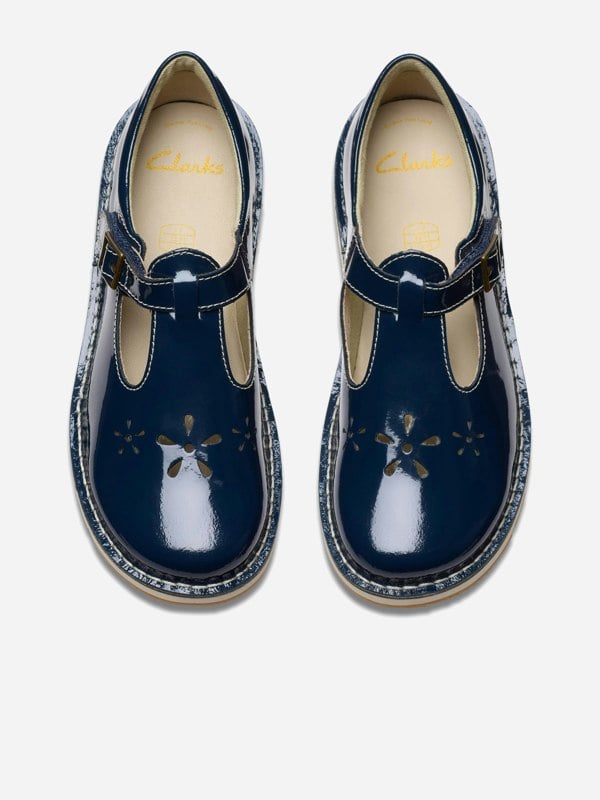 These girls’ Joyful Skip K ballerina pumps from British label Clarks come in navy patent and take inspiration from the Joyance sandal first sold in 1933. A round toe and cut-out uppers create a classic T-bar shape, finished with a faux buckle and adjustable rip tape fastening.