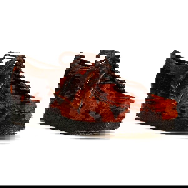 Premium moccasin style shoe featuring a cow hair-on hide upper, hand-stitched apron seam. Finished with a natural pebble crepe sole in a rich coffee colour for classic style and comfort.
