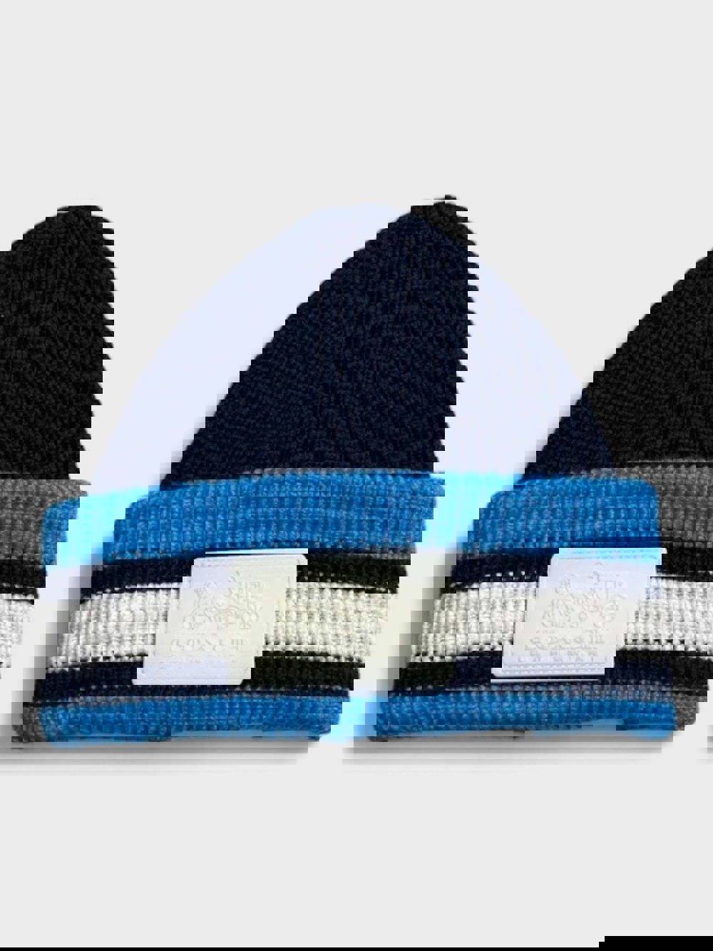 Crafted from soft, durable knit fabric, it features a classic varsity stripe patch detail that adds refined character to any winter wardrobe.