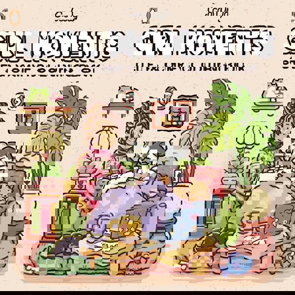 Girl Moments includes 45 unique illustrations centred on calm, comforting everyday joys. Scenes include a warm cup of tea in the morning and cosying up in bed with a book.