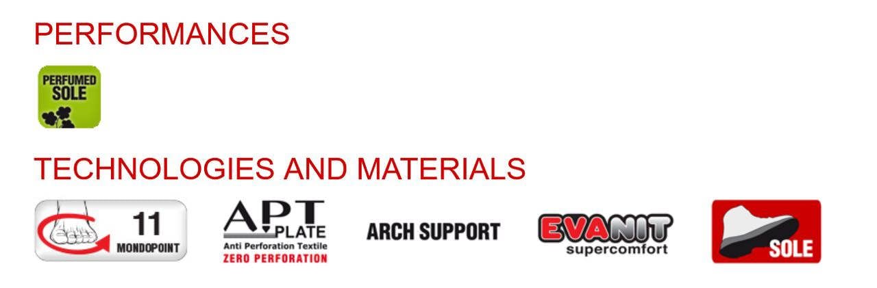 FOOTBED: EVANIT, made of EVA and nitrile special compound, with high bearing capacity and variable thickness (12mm - 8mm - 3,8mm). Thermoformed, anatomic, punched and coated with highly breathable fabric. Antistatic thanks to a specific treatment on the surface and to seams made of conductive yarns