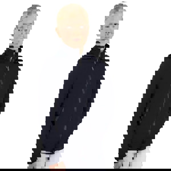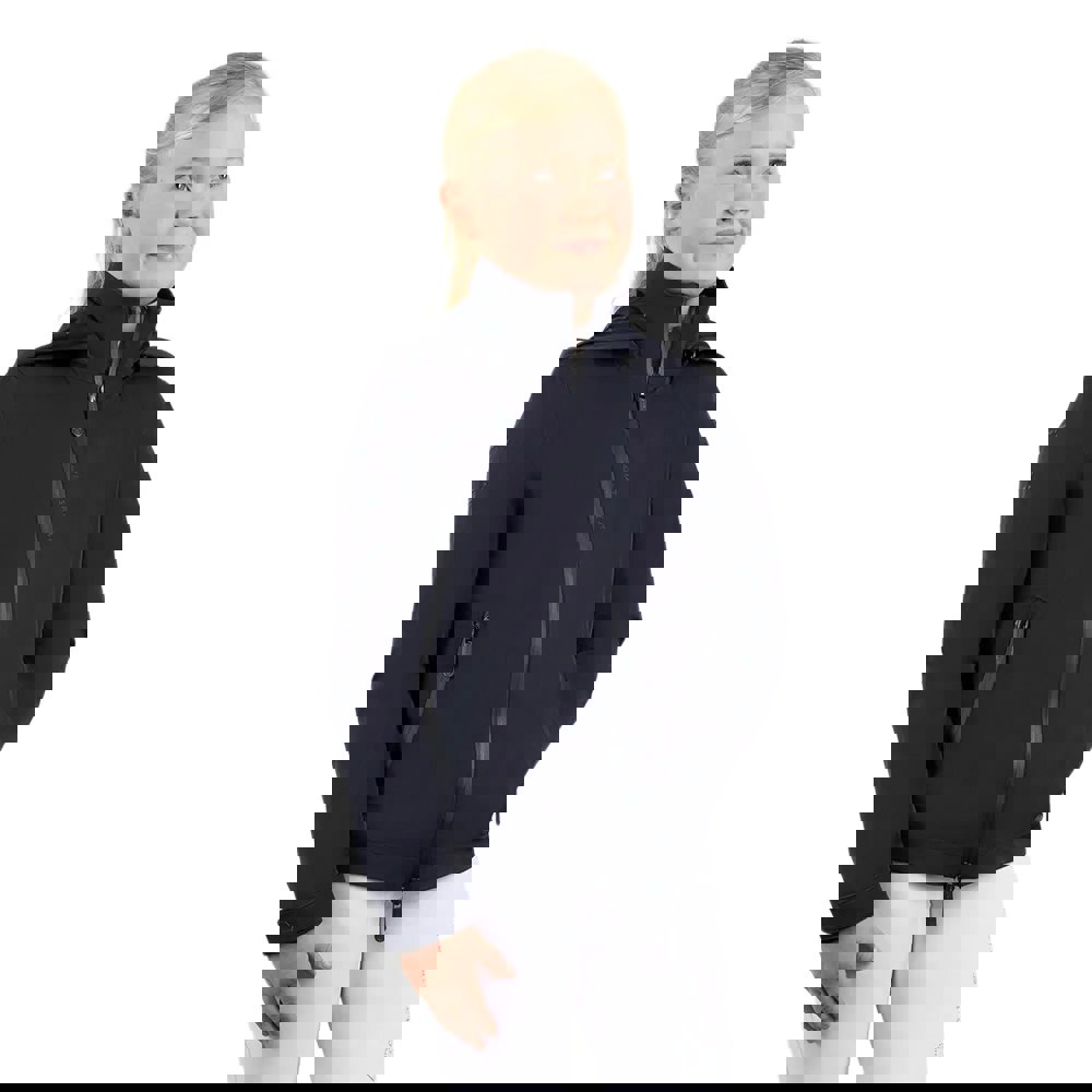 This children’s waterproof jacket comes in navy with a plain finish and logo detailing. It has a hooded neckline with a standing collar, plus long sleeves finished with touch fastening tabs at the cuffs. A full zip fastening runs through the front, completed with a branded zip pull.