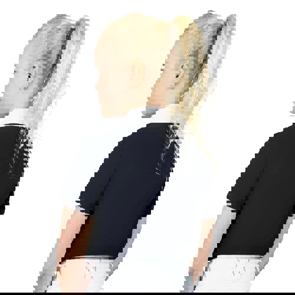 The Coldstream Girls Next Generation Elrick Show Shirt in black is designed with a high-neck silhouette and a tailored fit for a neat, streamlined look. With a pull-on style and a quarter zip fastening, it is easy to wear and adjust, making it a practical choice for busy days.