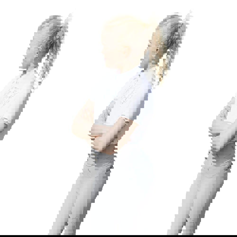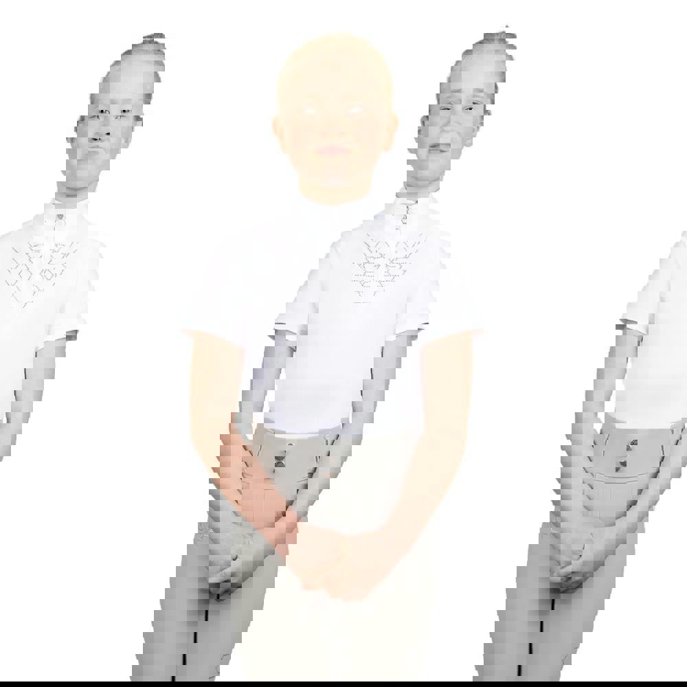 The Coldstream Girls Next Generation Ledmore Diamante Show Shirt in white is designed with a distinctive diamante and hexagon look, finished with a contrast standing collar. A zip neck with a half zip detail offers an adjustable fit at the neckline, making it easy to wear and style for a smart, polished appearance.