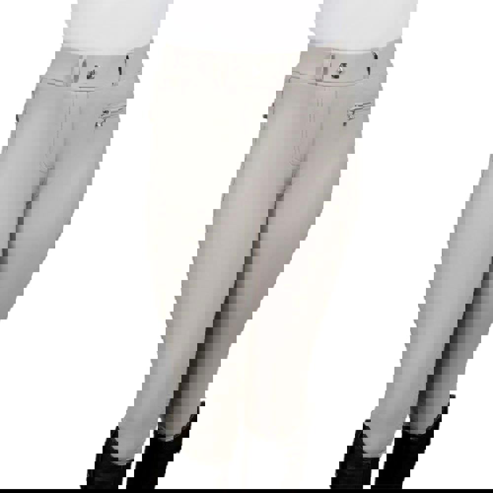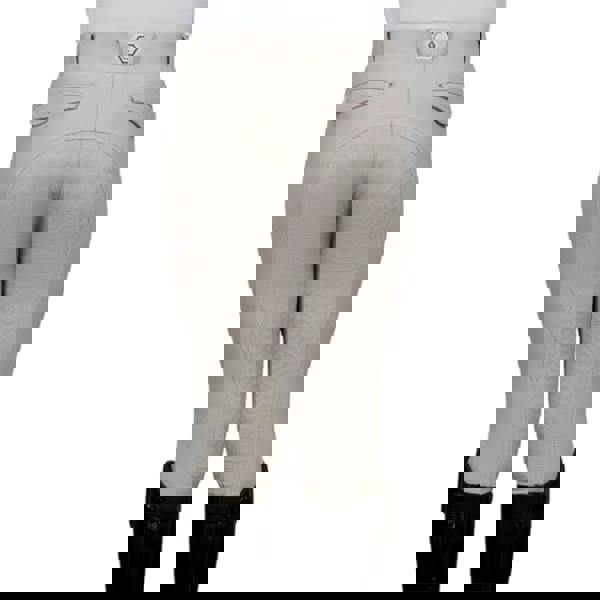 Coldstream Girls NG Carham Sparkle Horse Riding Tights in pearl grey combine a stretch fabric with a lightweight, water resistant finish. The design includes logo detailing, patterned and plain panels, visible stitching and diamante embellishments.